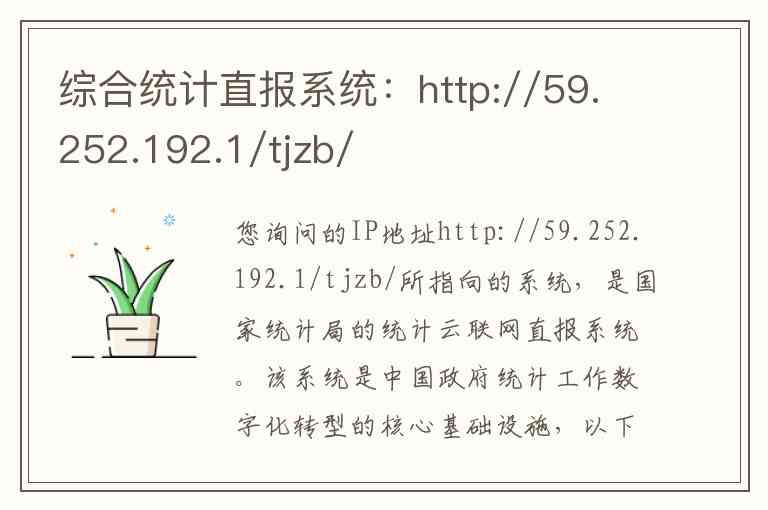 您询问的IP地址http://59.252.192.1/tjzb/所指向的系统,是国家统计局的统计云联网直报系统。该系统是中国政府统计工作数字化转型的核心基础设施,以下将对该系统进行详细说明。