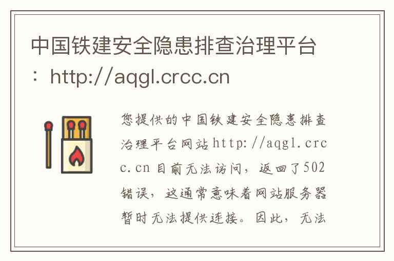 您提供的中国铁建安全隐患排查治理平台网站 http://aqgl.crcc.cn 目前无法访问,返回了502错误,这通常意味着网站服务器暂时无法提供连接。因此,无法直接从该网址获取其最新的具体内容和服务介绍。