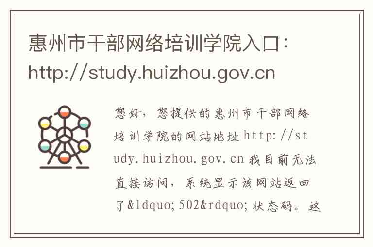 您好,您提供的惠州市干部网络培训学院的网站地址 http://study.huizhou.gov.cn 我目前无法直接访问,系统显示该网站返回了“502”状态码。这通常意味着网站服务器暂时无法提供连接或正在维护中,是一个临时性的技术问题,并非您本地网络的原因。