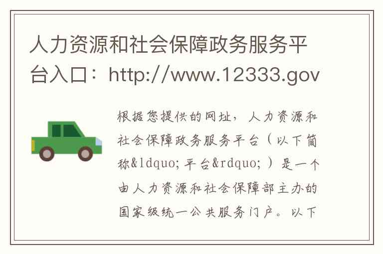 根据您提供的网址,人力资源和社会保障政务服务平台(以下简称“平台”)是一个由人力资源和社会保障部主办的国家级统一公共服务门户。以下是关于该平台内容、服务及联系方式的详细说明。