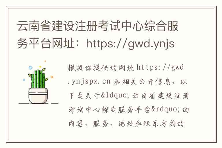 根据你提供的网址 https://gwd.ynjspx.cn 和相关公开信息,以下是关于“云南省建设注册考试中心综合服务平台”的内容、服务、地址和联系方式的详细说明。