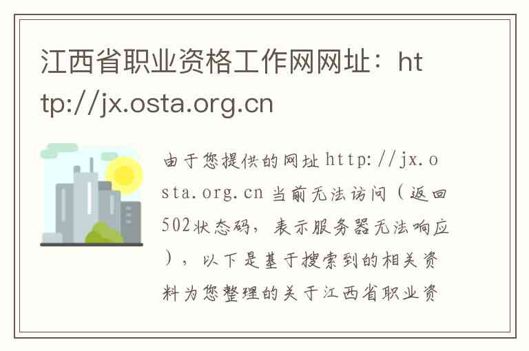 由于您提供的网址 http://jx.osta.org.cn 当前无法访问(返回502状态码,表示服务器无法响应),以下是基于搜索到的相关资料为您整理的关于江西省职业资格工作网的内容与服务说明,以及替代的联系方式和地址。