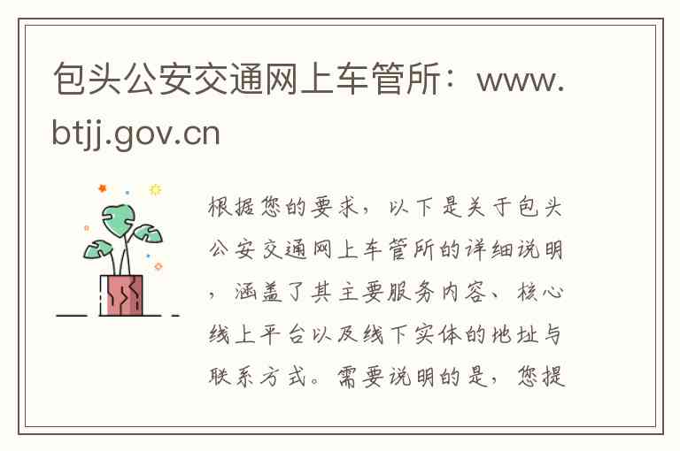 根据您的要求,以下是关于包头公安交通网上车管所的详细说明,涵盖了其主要服务内容、核心线上平台以及线下实体的地址与联系方式。需要说明的是,您提供的网址“www.btjj.gov.cn”在当前公开信息中较少被直接提及,目前包头交警的服务体系已主要整合至“交管12123”APP、包头交警微信公众号及线下自助网点。不过,您可以通过包头市公安局官方网站作为入口获取相关服务。