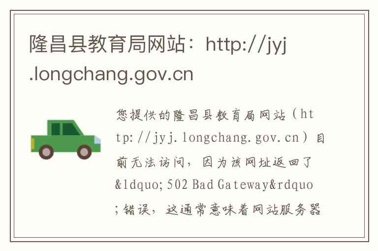 您提供的隆昌县教育局网站(http://jyj.longchang.gov.cn)目前无法访问,因为该网址返回了“502 Bad Gateway”错误,这通常意味着网站服务器暂时无法正常工作。