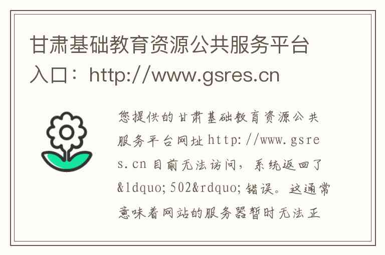 您提供的甘肃基础教育资源公共服务平台网址 http://www.gsres.cn 目前无法访问,系统返回了“502”错误。这通常意味着网站的服务器暂时无法正常工作,可能是正在进行维护或遇到了暂时的技术问题。