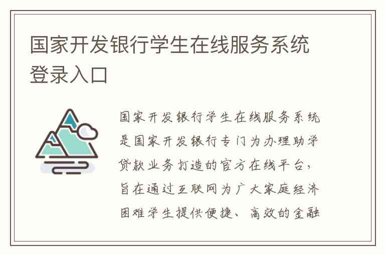国家开发银行学生在线服务系统是国家开发银行专门为办理助学贷款业务打造的官方在线平台,旨在通过互联网为广大家庭经济困难学生提供便捷、高效的金融服务。以下是对其登录入口、核心服务以及联系方式的详细说明。