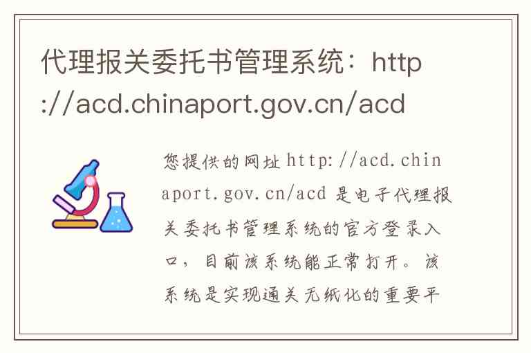 您提供的网址 http://acd.chinaport.gov.cn/acd 是电子代理报关委托书管理系统的官方登录入口,目前该系统能正常打开。该系统是实现通关无纸化的重要平台,由中国报关协会组织研发和管理,企业凭电子口岸IC卡或U盾即可登录使用-4-5-8。以下为您详细介绍其核心内容与服务: