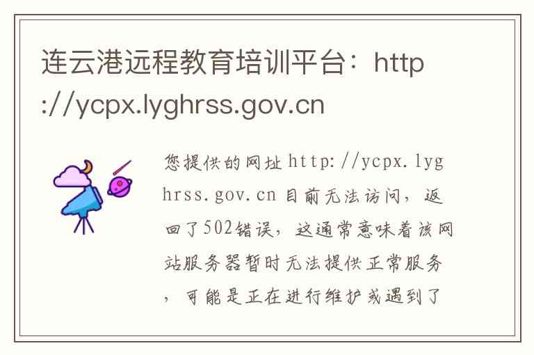 您提供的网址 http://ycpx.lyghrss.gov.cn 目前无法访问,返回了502错误,这通常意味着该网站服务器暂时无法提供正常服务,可能是正在进行维护或遇到了技术问题。