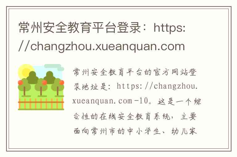 常州安全教育平台的官方网站登录地址是:https://changzhou.xueanquan.com -10。这是一个综合性的在线安全教育系统,主要面向常州市的中小学生、幼儿家长及教师,旨在通过信息化的方式,系统性地提升学生的安全素养和自我保护能力。