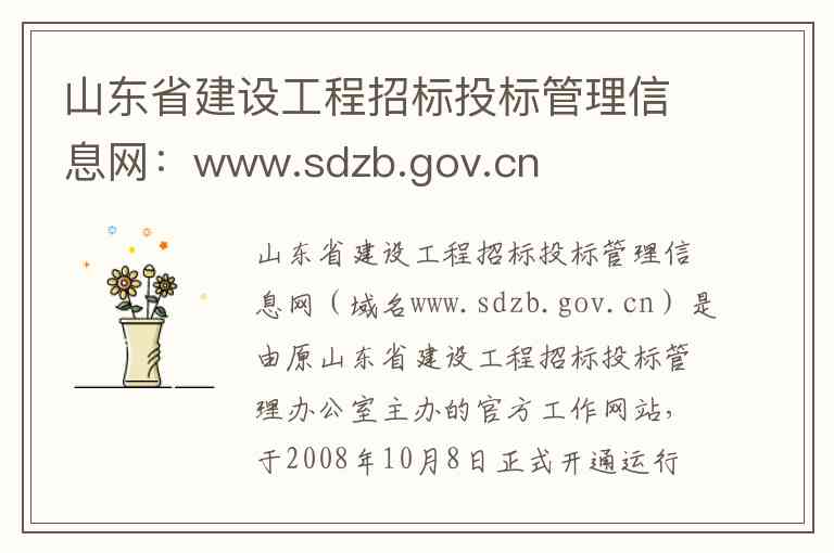 山东省建设工程招标投标管理信息网(域名www.sdzb.gov.cn)是由原山东省建设工程招标投标管理办公室主办的官方工作网站,于2008年10月8日正式开通运行 -1。该网站曾被指定为山东省依法必须招标工程发布招标类信息(如招标公告、中标公示)的官方媒介 -2-3。