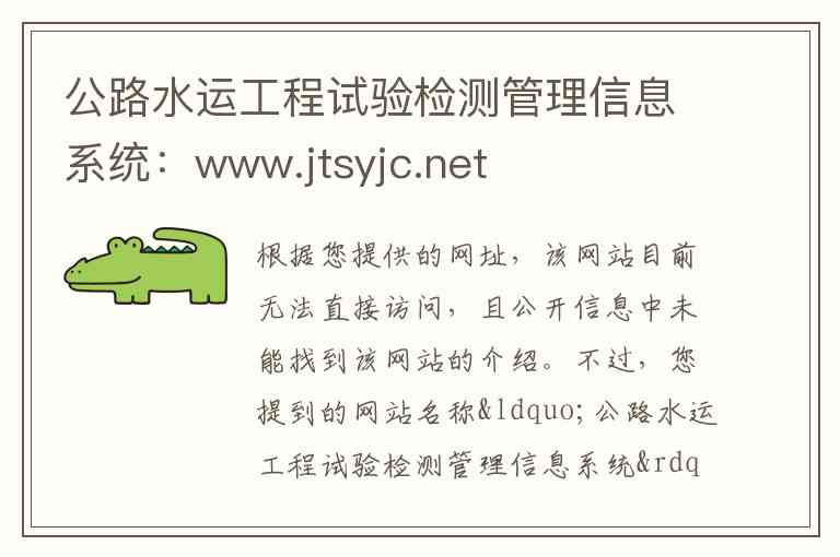根据您提供的网址,该网站目前无法直接访问,且公开信息中未能找到该网站的介绍。不过,您提到的网站名称“公路水运工程试验检测管理信息系统”与全国统一使用的官方平台高度相关,很可能是指公路水运工程质量检测管理信息系统。