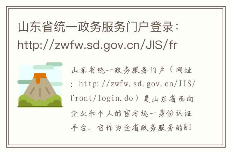 山东省统一政务服务门户(网址:http://zwfw.sd.gov.cn/JIS/front/login.do)是山东省面向企业和个人的官方统一身份认证平台。它作为全省政务服务的“总门户”和“总钥匙”,主要提供以下内容和服务: