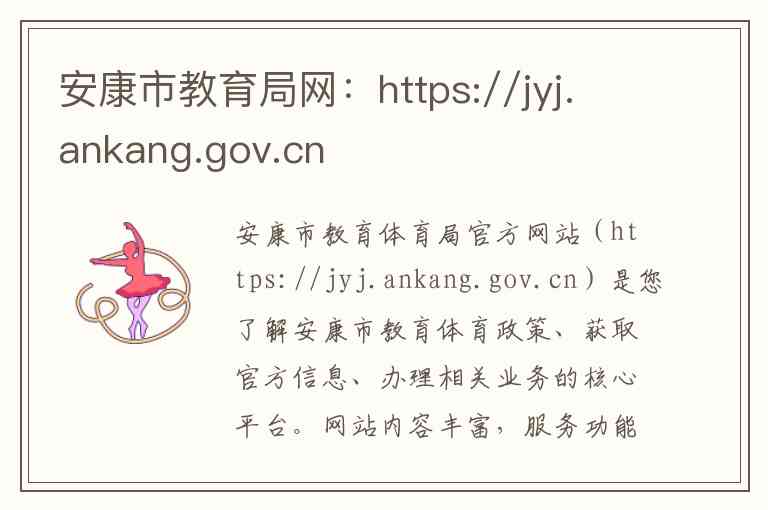 安康市教育体育局官方网站(https://jyj.ankang.gov.cn)是您了解安康市教育体育政策、获取官方信息、办理相关业务的核心平台。网站内容丰富,服务功能清晰,以下为您详细介绍其内容与服务,并附上地址和联系方式。