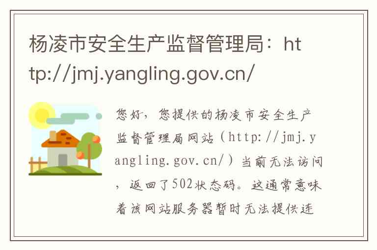 您好,您提供的杨凌市安全生产监督管理局网站(http://jmj.yangling.gov.cn/)当前无法访问,返回了502状态码。这通常意味着该网站服务器暂时无法提供连接,可能是由于维护、网络问题或网站地址已变更。