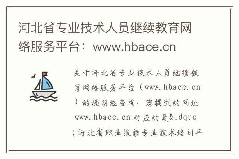经查询,您提到的网址 www.hbace.cn 对应的是“河北省职业技能专业技术培训平台”,曾用名或通用名称为“河北省专业技术人员继续教育网络服务平台”。该平台是河北省专业技术人员进行继续教育的重要在线学习入口之一。以下为您详细介绍其内容、服务及相关信息。