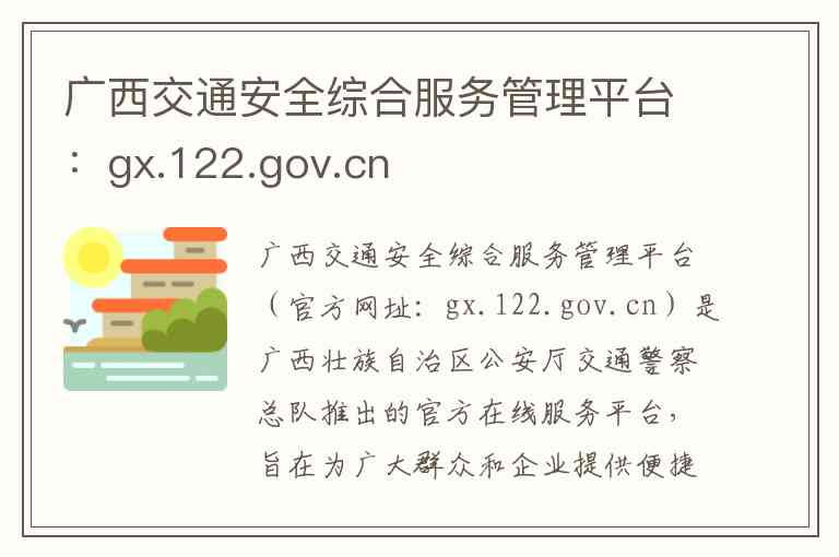 广西交通安全综合服务管理平台(官方网址:gx.122.gov.cn)是广西壮族自治区公安厅交通警察总队推出的官方在线服务平台,旨在为广大群众和企业提供便捷的交通管理业务办理与信息服务-1。以下是对其内容、服务及联系方式的详细说明。
