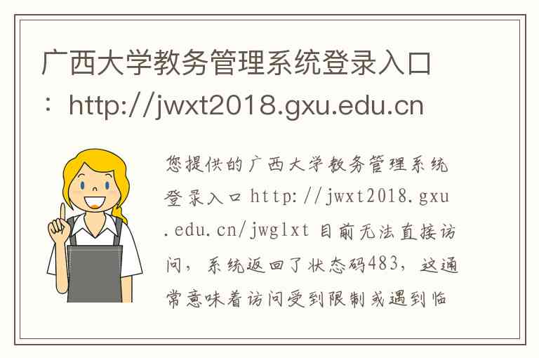 您提供的广西大学教务管理系统登录入口 http://jwxt2018.gxu.edu.cn/jwglxt 目前无法直接访问,系统返回了状态码483,这通常意味着访问受到限制或遇到临时性技术问题,可能的原因包括需要校内网络环境、特定登录凭证或系统正在维护。