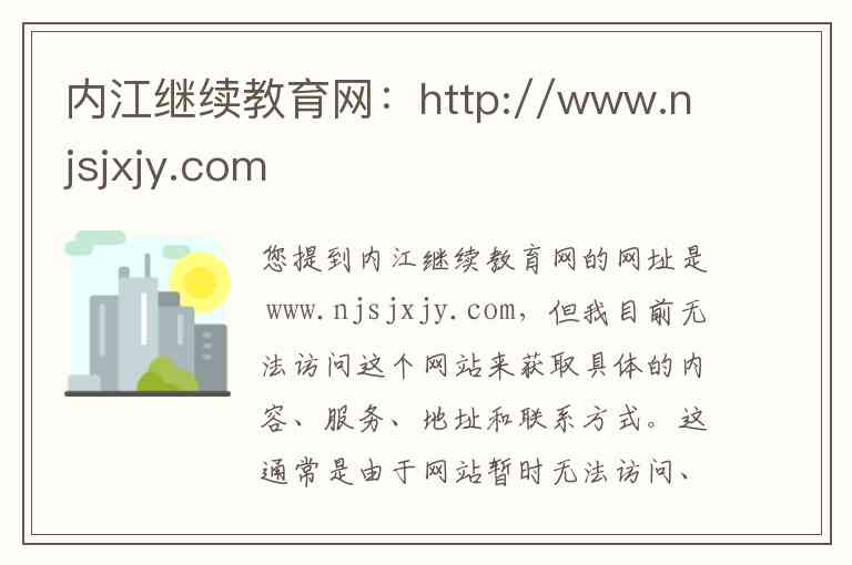 您提到内江继续教育网的网址是 www.njsjxjy.com,但我目前无法访问这个网站来获取具体的内容、服务、地址和联系方式。这通常是由于网站暂时无法访问、服务器维护,或者网站本身的结构限制了自动读取。