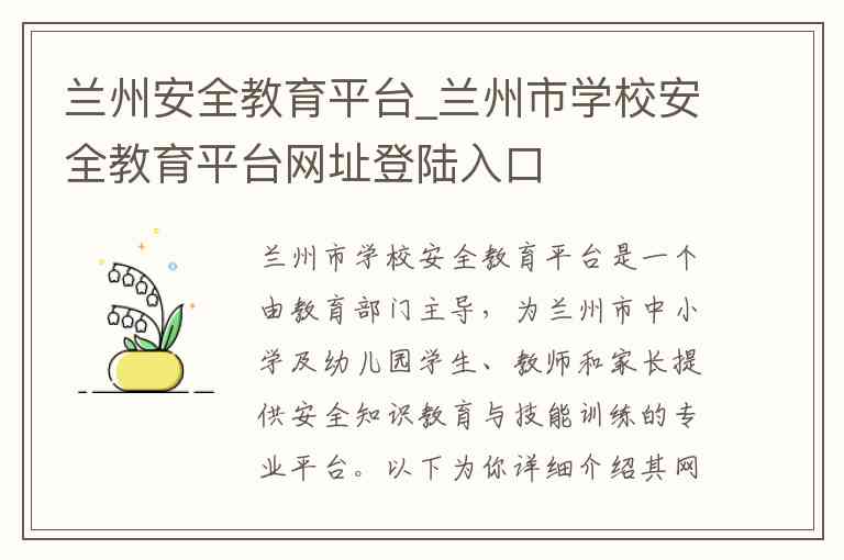 兰州市学校安全教育平台是一个由教育部门主导,为兰州市中小学及幼儿园学生、教师和家长提供安全知识教育与技能训练的专业平台。以下为你详细介绍其网址登陆入口、核心内容与服务,以及相关的联系方式。
