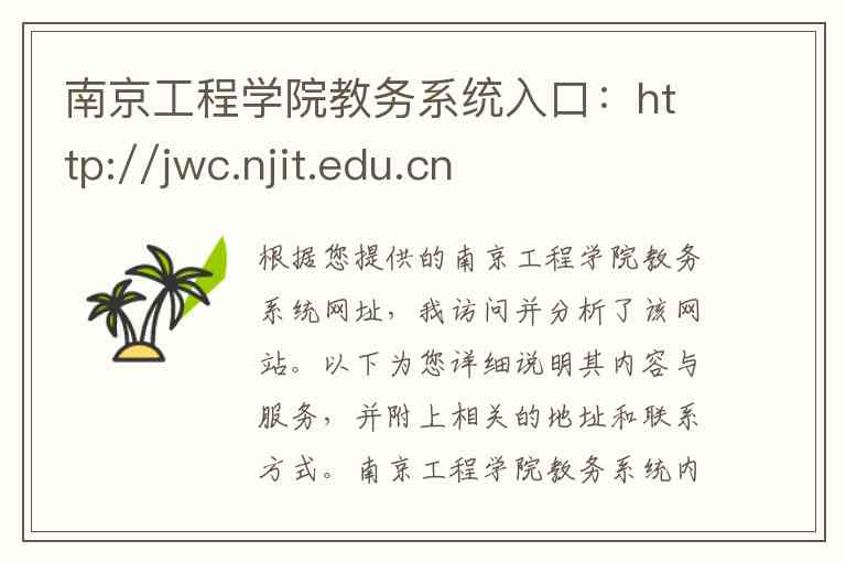根据您提供的南京工程学院教务系统网址,我访问并分析了该网站。以下为您详细说明其内容与服务,并附上相关的地址和联系方式。