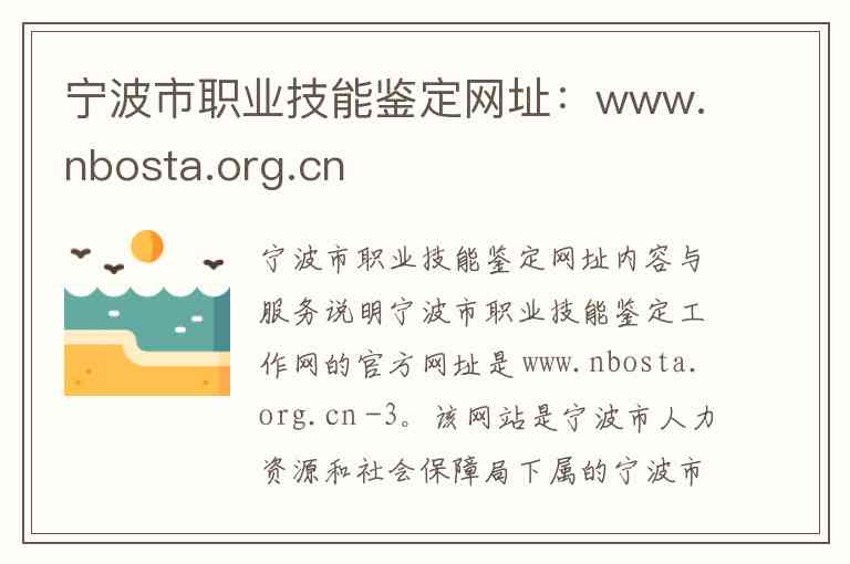 宁波市职业技能鉴定工作网的官方网址是 www.nbosta.org.cn -3。该网站是宁波市人力资源和社会保障局下属的宁波市社会保障卡管理服务和职业技能鉴定指导中心(也称宁波市职业技能鉴定指导中心)主办的官方服务平台,主要提供与职业技能鉴定、技能人才评价相关的各类信息与服务 -2-4-6。