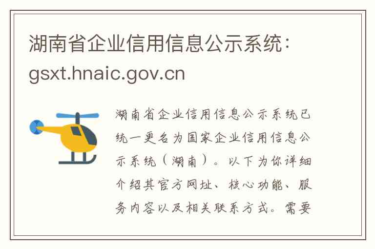 湖南省企业信用信息公示系统已统一更名为国家企业信用信息公示系统(湖南)。以下为你详细介绍其官方网址、核心功能、服务内容以及相关联系方式。