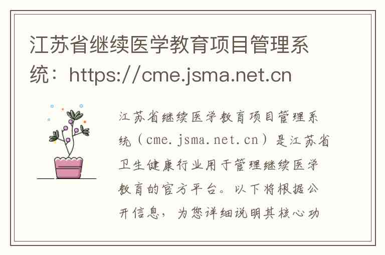 江苏省继续医学教育项目管理系统(cme.jsma.net.cn)是江苏省卫生健康行业用于管理继续医学教育的官方平台。以下将根据公开信息,为您详细说明其核心功能、服务内容及联系方式。