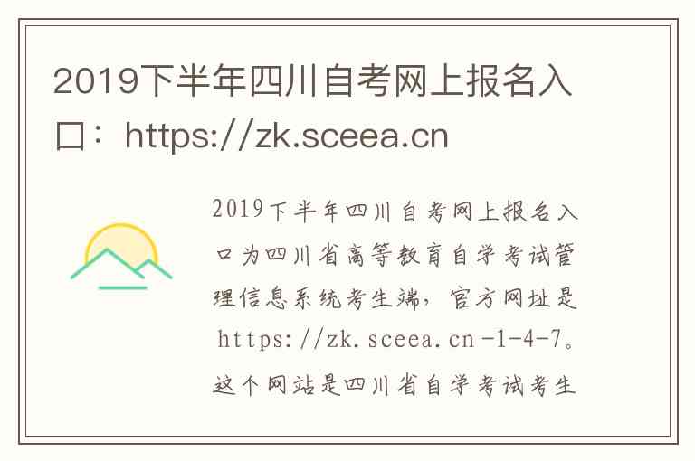 2019下半年四川自考网上报名入口为四川省高等教育自学考试管理信息系统考生端,官方网址是 https://zk.sceea.cn -1-4-7。这个网站是四川省自学考试考生进行网上报名、课程报考、考籍管理及信息查询的唯一官方指定平台-4-5-8。