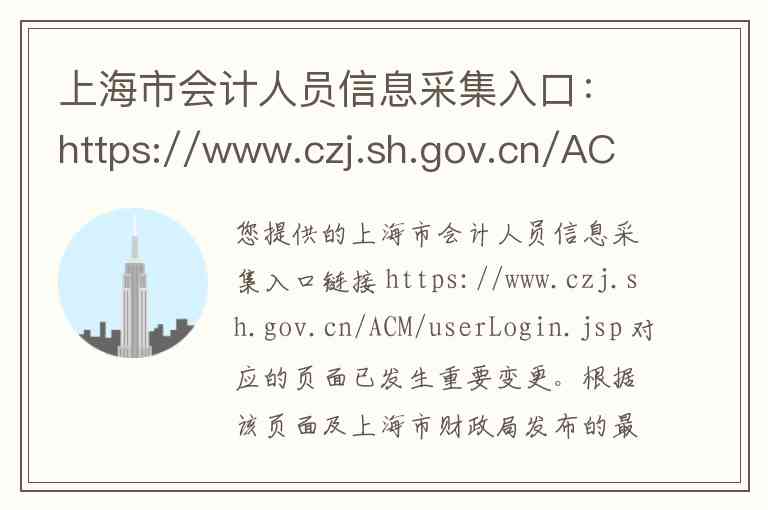 您提供的上海市会计人员信息采集入口链接 https://www.czj.sh.gov.cn/ACM/userLogin.jsp 对应的页面已发生重要变更。根据该页面及上海市财政局发布的最新通知,原上海市会计人员信息管理系统中的信息采集、属地关系调转、继续教育抵免申请等核心业务模块均已关闭-4。目前,相关业务已统一迁移至“全国会计人员统一服务管理平台”办理-1-4。