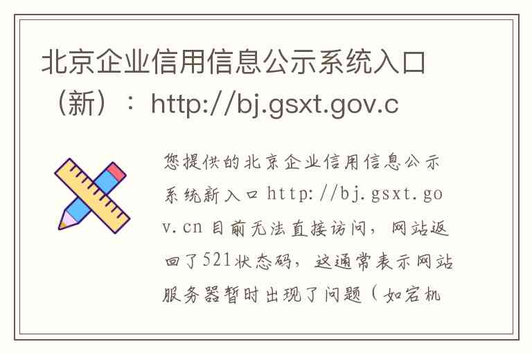 您提供的北京企业信用信息公示系统新入口 http://bj.gsxt.gov.cn 目前无法直接访问,网站返回了521状态码,这通常表示网站服务器暂时出现了问题(如宕机或正在维护),无法处理您的请求。建议您可以稍后再尝试访问。