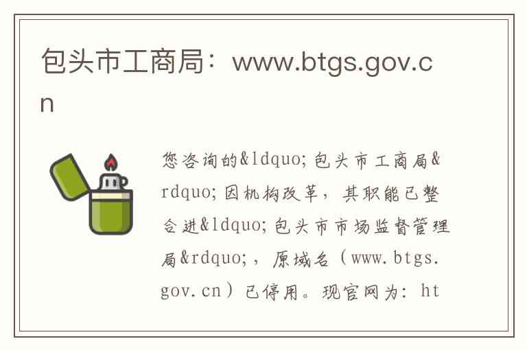 您咨询的“包头市工商局”因机构改革,其职能已整合进“包头市市场监督管理局”,原域名(www.btgs.gov.cn)已停用。现官网为:http://scjg.baotou.gov.cn/ -1-3-6。