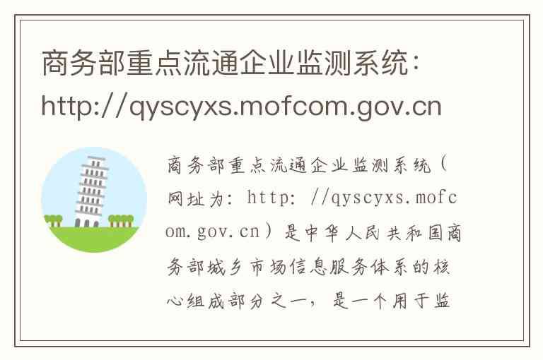 商务部重点流通企业监测系统(网址为:http://qyscyxs.mofcom.gov.cn)是中华人民共和国商务部城乡市场信息服务体系的核心组成部分之一,是一个用于监测分析中国流通行业运行状况的重要政务信息平台。该系统的主要功能是通过收集重点流通企业的经营数据,为政府决策、行业引导和企业经营提供信息支持,并起到引导生产和消费的“天气预报”作用[citation:1]。