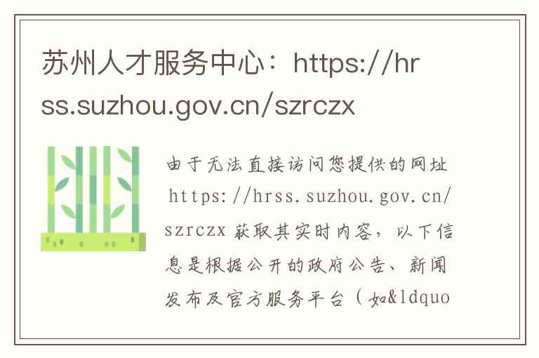 由于无法直接访问您提供的网址 https://hrss.suzhou.gov.cn/szrczx 获取其实时内容,以下信息是根据公开的政府公告、新闻发布及官方服务平台(如“姑苏人才总入口”、苏州市人民政府官网)为您整理的关于苏州市人才服务中心的详细介绍、主要服务内容、地址和联系方式。