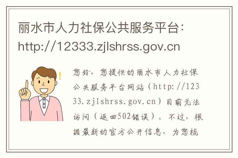 您好,您提供的丽水市人力社保公共服务平台网站(http://12333.zjlshrss.gov.cn)目前无法访问(返回502错误)。不过,根据最新的官方公开信息,为您梳理了当前丽水市人力社保的线上服务渠道、核心服务内容以及线下实体的联系方式。