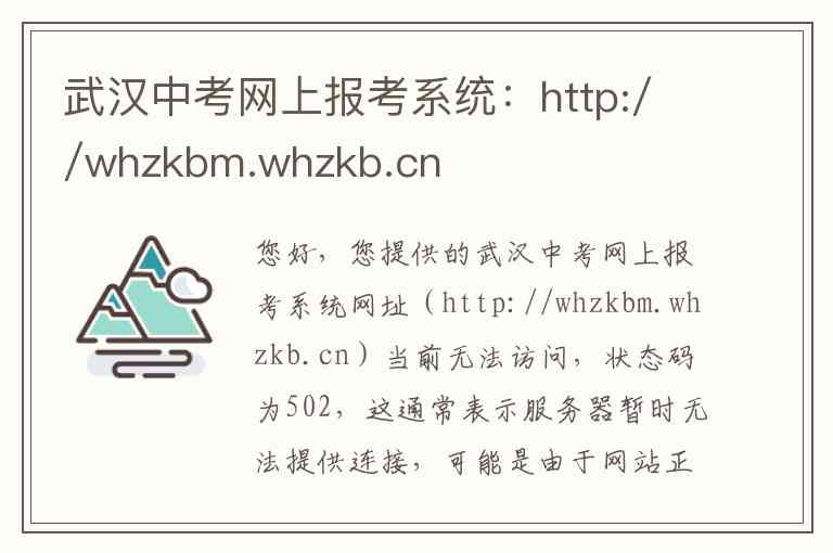 您好,您提供的武汉中考网上报考系统网址(http://whzkbm.whzkb.cn)当前无法访问,状态码为502,这通常表示服务器暂时无法提供连接,可能是由于网站正在维护或出现临时故障。