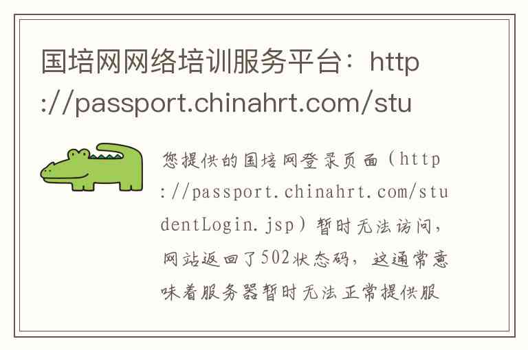 您提供的国培网登录页面(http://passport.chinahrt.com/studentLogin.jsp)暂时无法访问,网站返回了502状态码,这通常意味着服务器暂时无法正常提供服务,可能是由于维护或网络繁忙导致。您可以稍后再尝试访问。