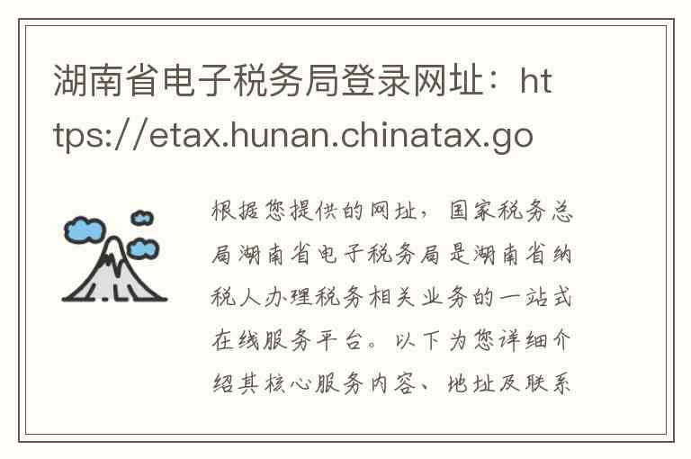 根据您提供的网址,国家税务总局湖南省电子税务局是湖南省纳税人办理税务相关业务的一站式在线服务平台。以下为您详细介绍其核心服务内容、地址及联系方式。