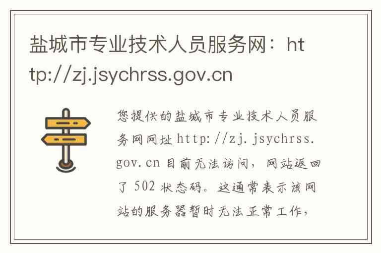 您提供的盐城市专业技术人员服务网网址 http://zj.jsychrss.gov.cn 目前无法访问,网站返回了 502 状态码。这通常表示该网站的服务器暂时无法正常工作,可能是由于维护、故障或网络问题导致的暂时性无法连接。