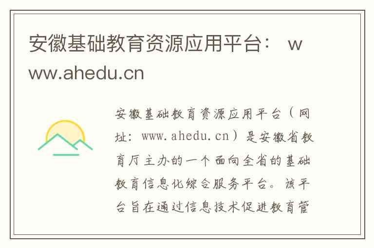 安徽基础教育资源应用平台(网址:www.ahedu.cn)是安徽省教育厅主办的一个面向全省的基础教育信息化综合服务平台。该平台旨在通过信息技术促进教育管理现代化,并推动优质教育资源的广泛应用与共享 -2。