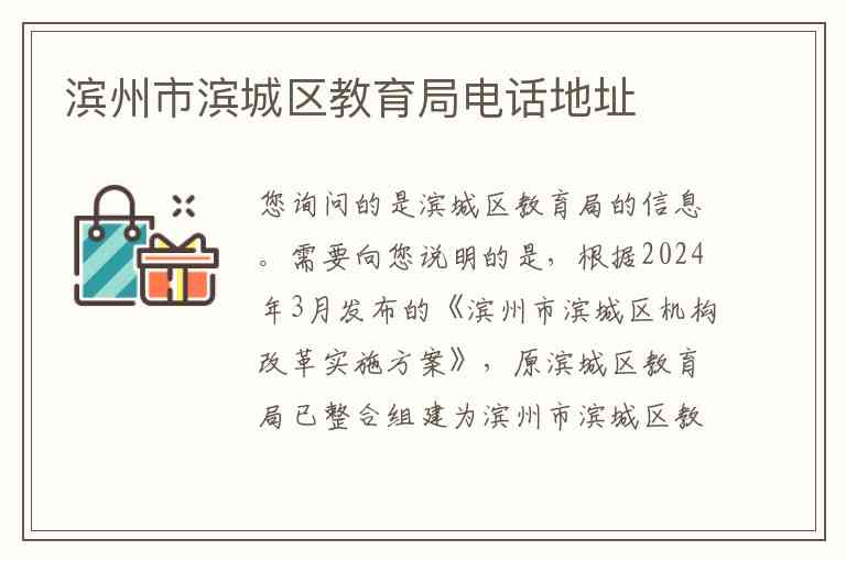您询问的是滨城区教育局的信息。需要向您说明的是,根据2024年3月发布的《滨州市滨城区机构改革实施方案》,原滨城区教育局已整合组建为滨州市滨城区教育和体育局,其办公地址和联系方式也发生了变化-3。以下是基于最新官方资料为您整理的具体信息: