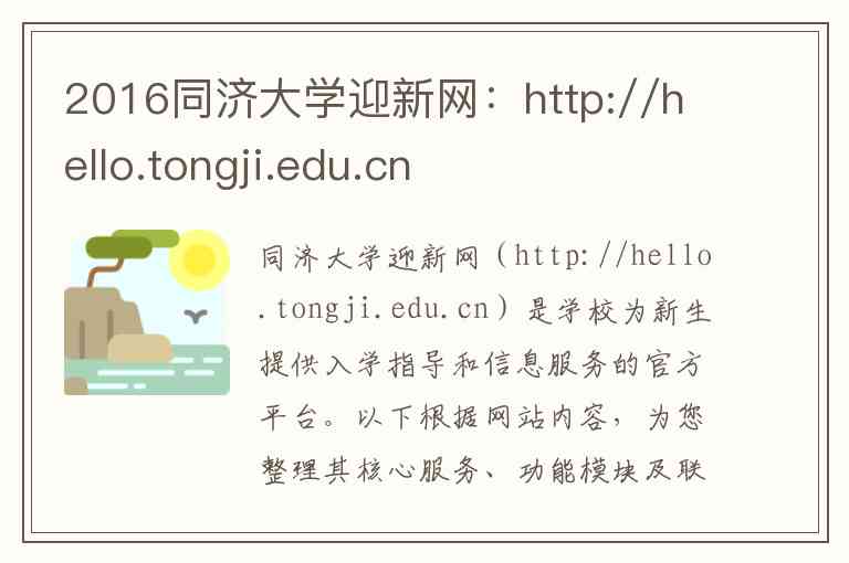 同济大学迎新网(http://hello.tongji.edu.cn)是学校为新生提供入学指导和信息服务的官方平台。以下根据网站内容,为您整理其核心服务、功能模块及联系方式。