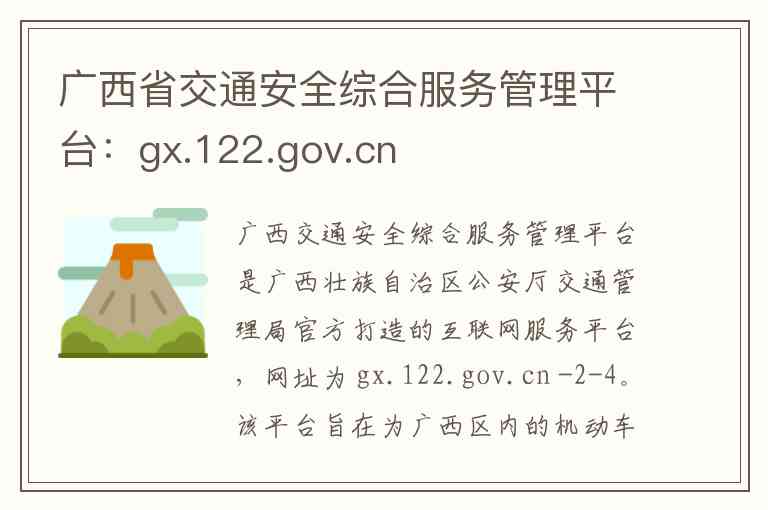 广西交通安全综合服务管理平台是广西壮族自治区公安厅交通管理局官方打造的互联网服务平台,网址为 gx.122.gov.cn -2-4。该平台旨在为广西区内的机动车所有人、驾驶人以及各类企事业单位提供便捷的交通管理“一站式”在线服务 -1。