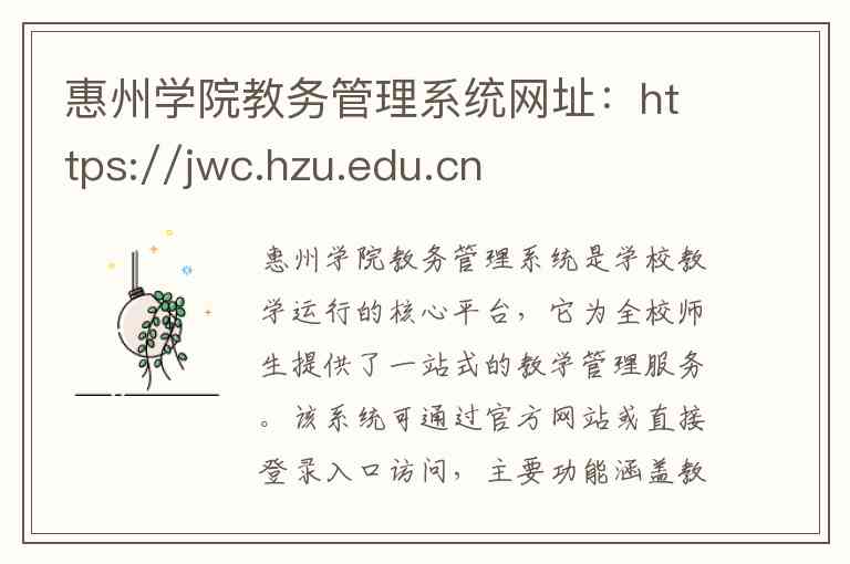 惠州学院教务管理系统是学校教学运行的核心平台,它为全校师生提供了一站式的教学管理服务。该系统可通过官方网站或直接登录入口访问,主要功能涵盖教学运行的各个环节。