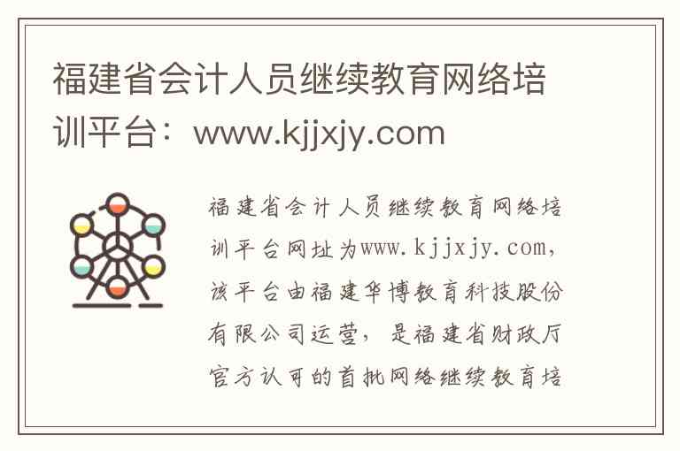 福建省会计人员继续教育网络培训平台网址为www.kjjxjy.com,该平台由福建华博教育科技股份有限公司运营,是福建省财政厅官方认可的首批网络继续教育培训机构之一-2-4-5。以下是关于该平台的服务内容、使用流程及联系方式的详细说明。