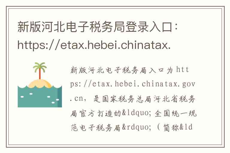 新版河北电子税务局入口为 https://etax.hebei.chinatax.gov.cn,是国家税务总局河北省税务局官方打造的“全国统一规范电子税务局”(简称“新电子税局”),为纳税人缴费人提供“一网通办”的数字化税费服务 -1。