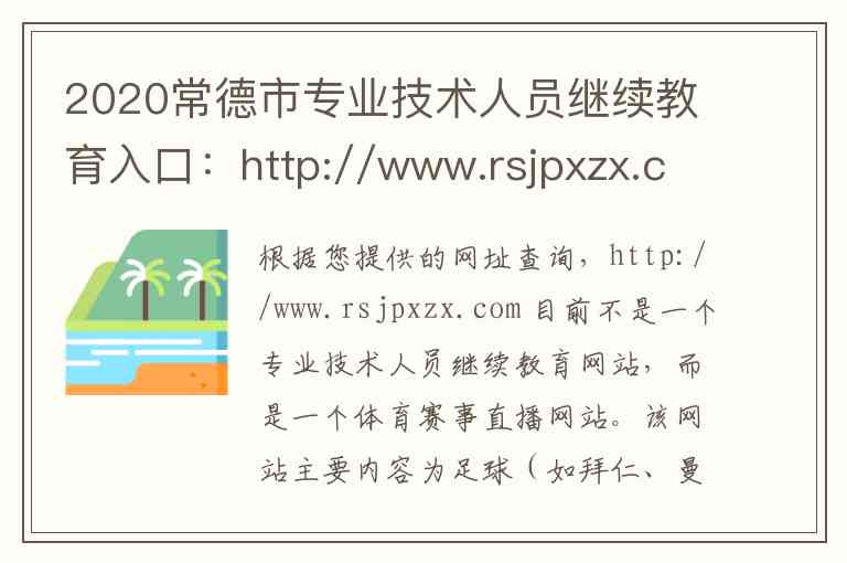 根据您提供的网址查询,http://www.rsjpxzx.com 目前不是一个专业技术人员继续教育网站,而是一个体育赛事直播网站。该网站主要内容为足球(如拜仁、曼联、阿森纳等)和篮球(如猛龙、公牛、湖人等)赛事的直播与信息,与您查询的“2020常德市专业技术人员继续教育”完全无关。