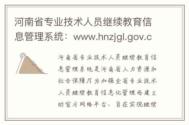 河南省专业技术人员继续教育信息管理系统是河南省人力资源和社会保障厅为加强全省专业技术人员继续教育信息化管理而建立的官方网络平台,旨在实现继续教育信息管理的网络化、规范化和制度化-4。该系统为各企事业单位、行业主管部门、人社部门和施教机构提供了一个专业技术人员基本信息共享、学习成果互通互认的公共网络服务平台-4-7。