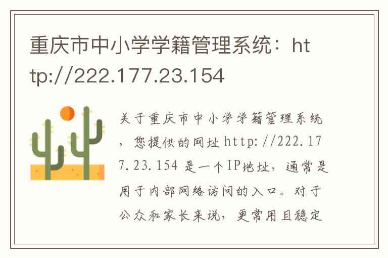 关于重庆市中小学学籍管理系统,您提供的网址 http://222.177.23.154 是一个IP地址,通常是用于内部网络访问的入口。对于公众和家长来说,更常用且稳定的访问地址是重庆市学籍管理服务平台,其域名为 http://zxxs.emis.cq.cn -3。