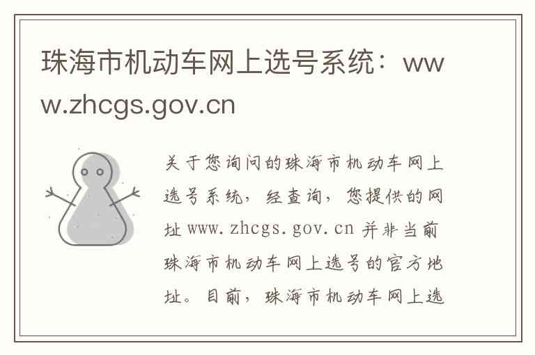 关于您询问的珠海市机动车网上选号系统,经查询,您提供的网址 www.zhcgs.gov.cn 并非当前珠海市机动车网上选号的官方地址。目前,珠海市机动车网上选号的官方统一平台是“交通安全综合服务管理平台”,其网址为 https://gd.122.gov.cn/ -1-3-4。