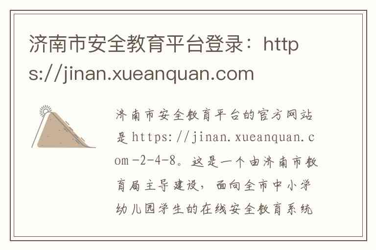 济南市安全教育平台的官方网站是 https://jinan.xueanquan.com -2-4-8。这是一个由济南市教育局主导建设,面向全市中小学幼儿园学生的在线安全教育系统 -1-5-7。以下为您详细介绍其内容、服务及联系方式。